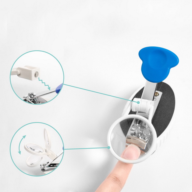 PRODUCT DA-5222 Nail Clipper w/ Magnifier ● Base Size / 100 x 56 x 14mm ● Weight / 80g ● Magnification / 4x Description This nail clipper has a suction base to secure it on a non porous surface and magnifier makes nail clipping easier to see without having to bend right over. Back