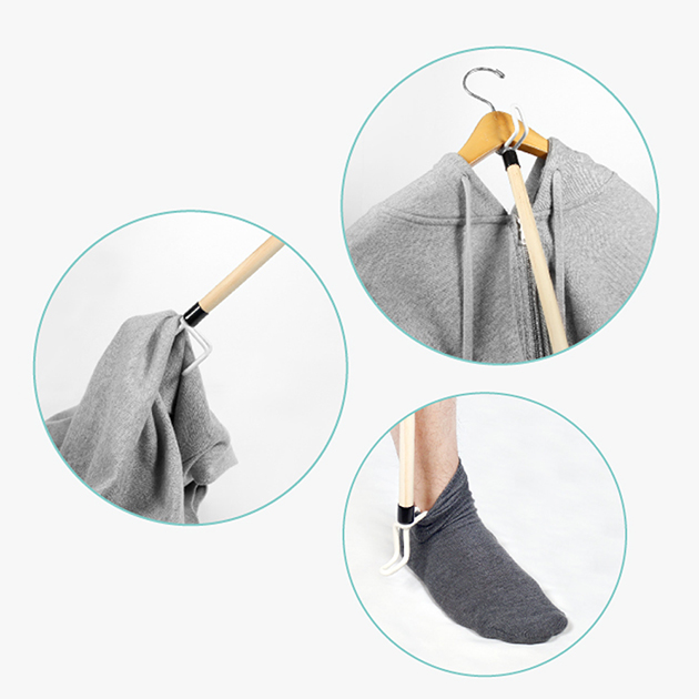 PRODUCT DA-5201(18/27) Dressing Stick DA-5201: ● Length / 27" ● Weight / 117g DA-5201-18: ● Length / 18" ● Weight / 87g Description A lightweight device for positioning and locating clothing featuring a smooth wooden shaft hook with a large plastic coated "C" hook at one end and a specially shaped "push/pull" hook at the other. Back