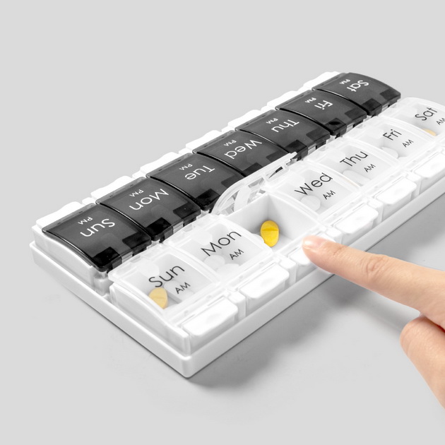PRODUCT HA-4146 Push Button AM/PM 7 Days Pill Dispenser ● Size / (L) 228 x (W) 1155 x (H) 27mm● Weight / 180g ● DO NOT use in the dishwasher. ● DO NOT use UV light to disinfect the product. Description Each compartment can be opened individally with the push button. Medications for the week are easily planned and organized in daily, marked compartments. Back