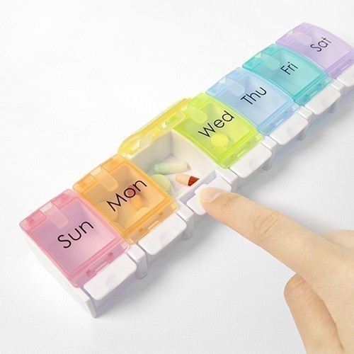 PRODUCT HA-4145 Push Button 7 Days Pill Dispenser ● Size / (L) 224 x (W) 55 x (H) 26mm ● Weight / 70g ● DO NOT use in the dishwasher. ● DO NOT use UV light to disinfect the product. Description Each compartment can be opened individally with the push button. Medications for the week are easily planned and organized in daily, marked compartments. Back